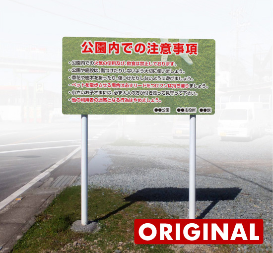 フェンスや壁面など、看板を取り付けられる場所がなくても、脚(看板用支柱)から設置することでオリジナルデザインの自立式看板を掲出できますよ!